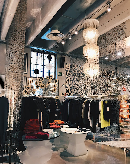 Cette petite boutique se trouve dans une rue commerçante de Milan. Nous y sommes rentrés par hasard et finalement, nous avons dû y rester presque 2 heures. Cette boutique est un vrai lieu de vie. Au rez-de-chaussée, il y a magasin de vêtements avec de nombreuses marques de luxe italiennes.