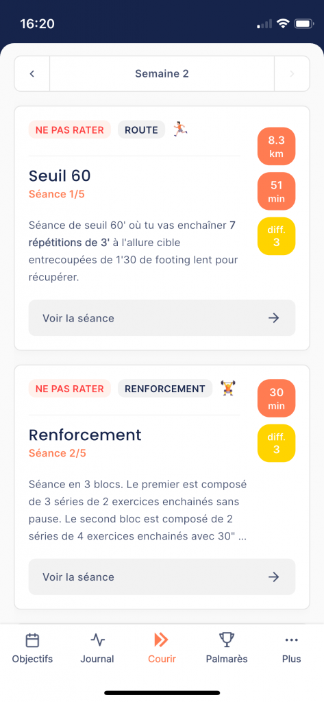 Sur l’application Campus Coach, tu as plusieurs séances : la course et le renforcement musculaire. Ces séances sont directement intégrées dans ton programme chaque semaine. Tu peux d’ailleurs choisir le rythme de ta préparation et dire combien de séances, tu veux avoir au maximum par semaine.
