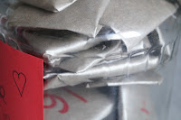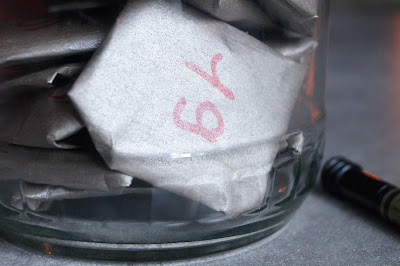 Pour le faire, on a tout simplement emballé avec des chutes de papiers cadeaux ( et oui on gaspille pas ) les sachets un par un et on les a numérotés !